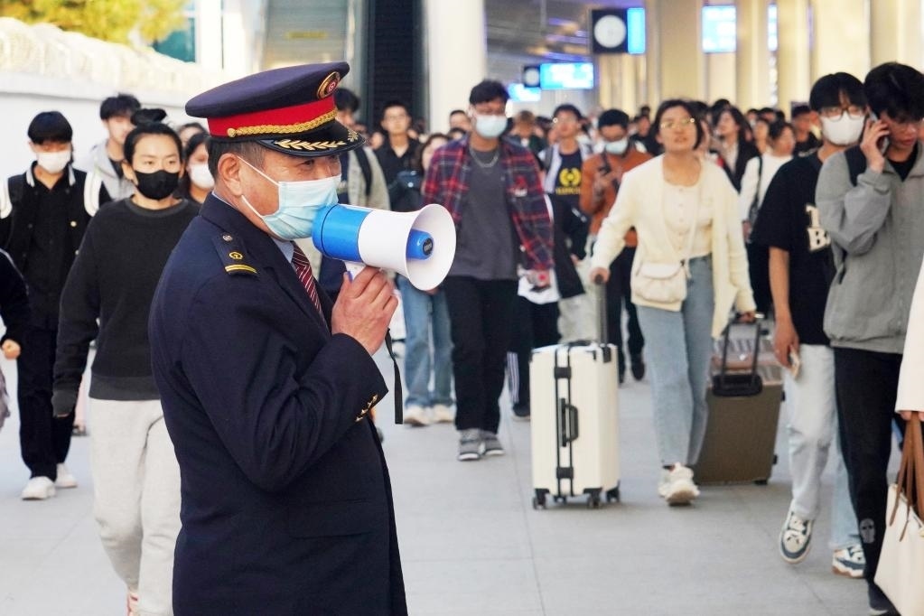 淄博火車(chē)站工作人員在引導(dǎo)出站旅客。新華社發(fā)(劉炳友 攝)