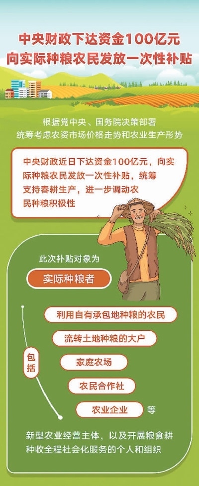 為此,國家統(tǒng)籌考慮農(nóng)資市場價格走勢和農(nóng)業(yè)生產(chǎn)形勢,中央財政向?qū)嶋H種糧農(nóng)民發(fā)放一次性補(bǔ)貼100億元,以穩(wěn)定農(nóng)民收入、保護(hù)農(nóng)民種糧積極性。