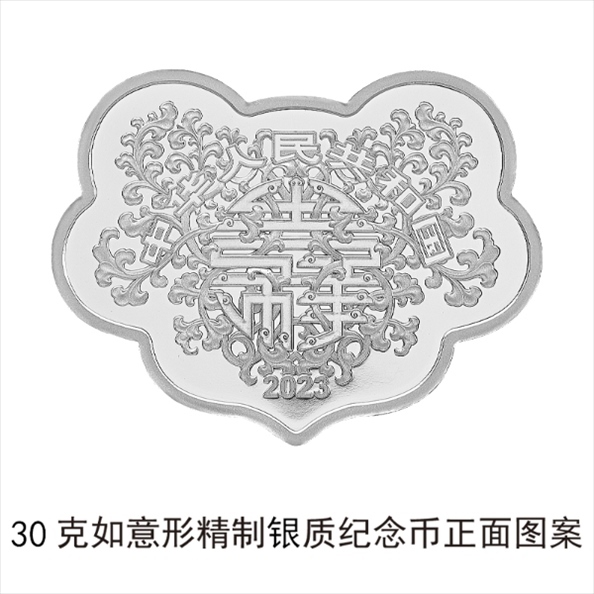30克如意形銀質紀念幣為精制幣,含純銀30克,外接矩形36毫米×47毫米,面額10元,成色99.9%,最大發(fā)行量20000枚。