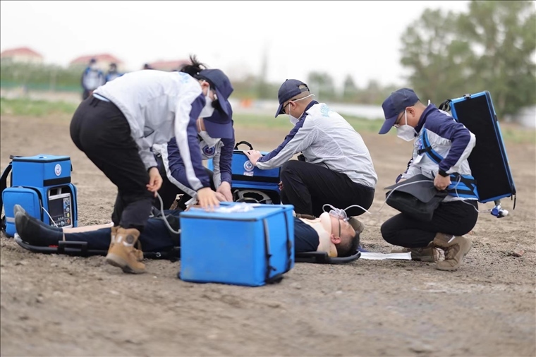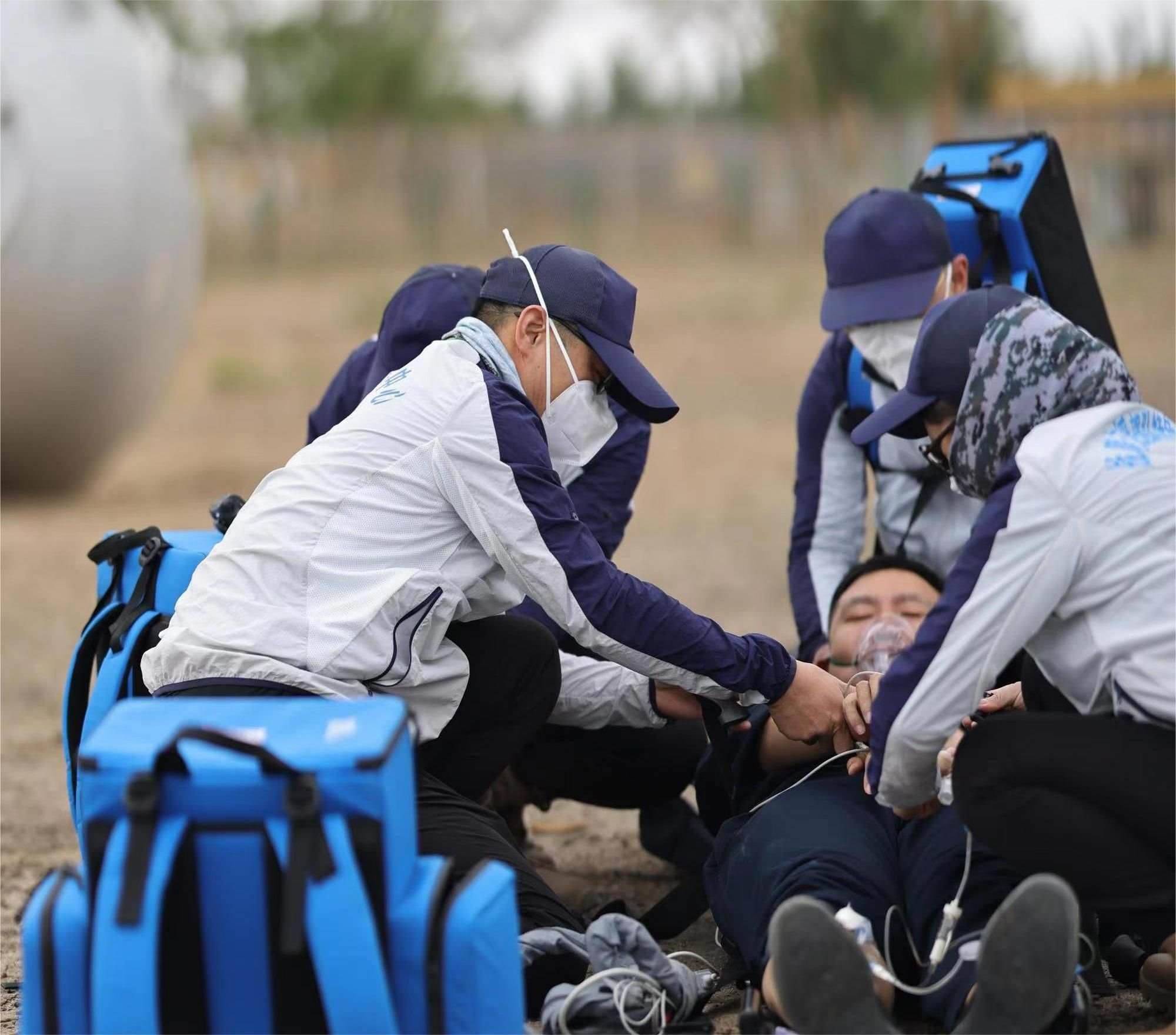 醫(yī)學(xué)急救“白金10分鐘、黃金1小時(shí)”,針對(duì)可能出現(xiàn)的飛船返回偏離落點(diǎn),落在沙漠、山地、湖泊,搜救直升機(jī)無法降落,車輛無法進(jìn)入的情況,為快速到達(dá)著陸地點(diǎn),醫(yī)療救護(hù)隊(duì)員每天隨身攜帶艙前急救設(shè)備堅(jiān)持訓(xùn)練六七個(gè)小時(shí),負(fù)重在沙漠、山地中奔跑,爭(zhēng)取最短時(shí)間展開緊急救治。夏日戈壁驕陽似火,風(fēng)沙彌漫,訓(xùn)練一天下來,隊(duì)員們耳朵眼里都是沙土,臉上脖子全是泥印,一個(gè)個(gè)都成了泥人。茫茫大草原記錄了神舟載人飛行任務(wù)醫(yī)療隊(duì)員們一次次醫(yī)療救護(hù)空地協(xié)同演練、全域協(xié)同演練的身影……