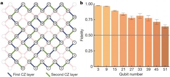 利用“祖沖之二號(hào)”完成的51比特一維簇態(tài)制備的線(xiàn)路及量子態(tài)保真度結(jié)果。(研究團(tuán)隊(duì)供圖)