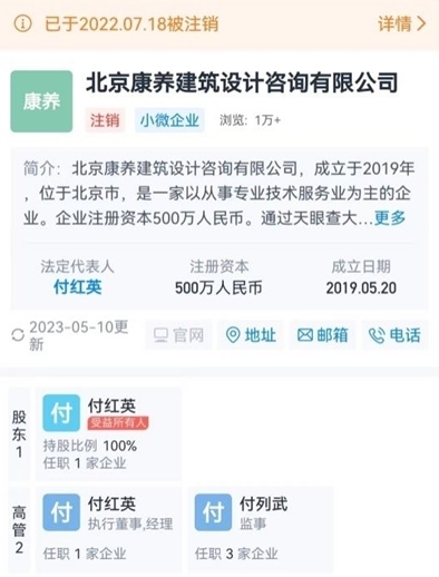 在付列武成為中冶吉信和康和信兩家公司一把手的一周之后,康和信就全資收購了一家個人獨資企業(yè)北京康養(yǎng)建筑設計咨詢有限公司,被收購的北京康養(yǎng)公司的監(jiān)事是付列武自己,法定代表人是付紅英,付紅英100%持股北京康養(yǎng)建筑設計咨詢有限公司。