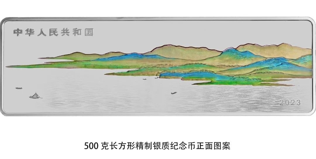 500克長方形銀質(zhì)紀(jì)念幣正面圖案為山、水等組合設(shè)計,并刊國名、年號。