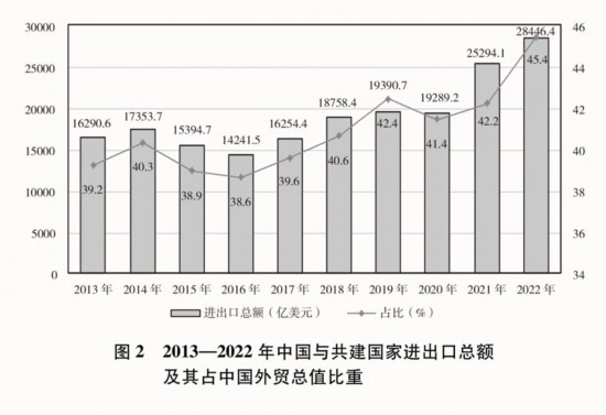 貿(mào)易投資規(guī)模穩(wěn)步擴(kuò)大。2013-2022年,中國(guó)與共建國(guó)家進(jìn)出口總額累計(jì)19.1萬(wàn)億美元,年均增長(zhǎng)6.4%;與共建國(guó)家雙向投資累計(jì)超過(guò)3800億美元,其中中國(guó)對(duì)外直接投資超過(guò)2400億美元;中國(guó)在共建國(guó)家承包工程新簽合同額、完成營(yíng)業(yè)額累計(jì)分別達(dá)到2萬(wàn)億美元、1.3萬(wàn)億美元。2022年,中國(guó)與共建國(guó)家進(jìn)出口總額近2.9萬(wàn)億美元,占同期中國(guó)外貿(mào)總值的45.4%,較2013年提高了6.2個(gè)百分點(diǎn);中國(guó)民營(yíng)企業(yè)對(duì)共建國(guó)家進(jìn)出口總額超過(guò)1.5萬(wàn)億美元,占同期中國(guó)與共建國(guó)家進(jìn)出口總額的53.7%。