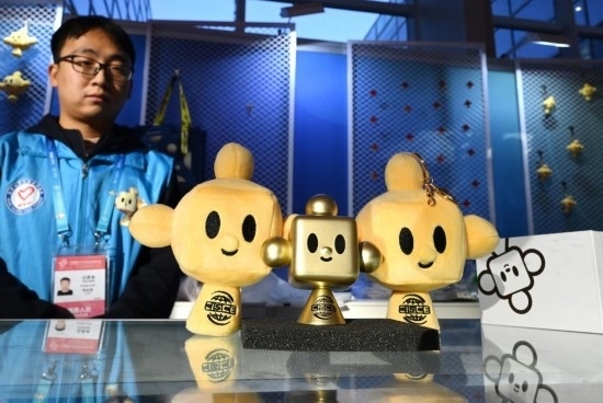 11月29日,在鏈博會(huì)文創(chuàng)小店的柜臺(tái)上放置著“鏈氪”形象的文創(chuàng)用品供觀展者選購。