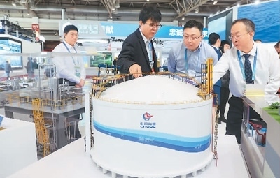 11月29日,在北京舉行的首屆中國(guó)國(guó)際供應(yīng)鏈促進(jìn)博覽會(huì)上,參觀者了解中海石油獨(dú)創(chuàng)的擁有自主知識(shí)產(chǎn)權(quán)的全容式液化天然氣(LNG)儲(chǔ)罐。陳曉根攝(人民視覺)