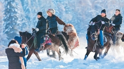 新疆維吾爾自治區(qū)阿勒泰地區(qū)富蘊(yùn)縣可可托海鎮(zhèn)塔拉特村,村民為游客表演叼羊。新華社記者 丁 磊攝