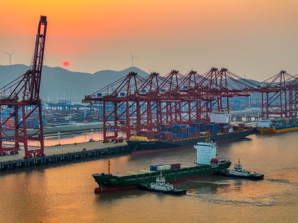 2024年2月11日,寧波舟山港金塘港區(qū)船來船往,碼頭作業(yè)繁忙(無人機(jī)照片)。新華社發(fā)(姚峰攝)