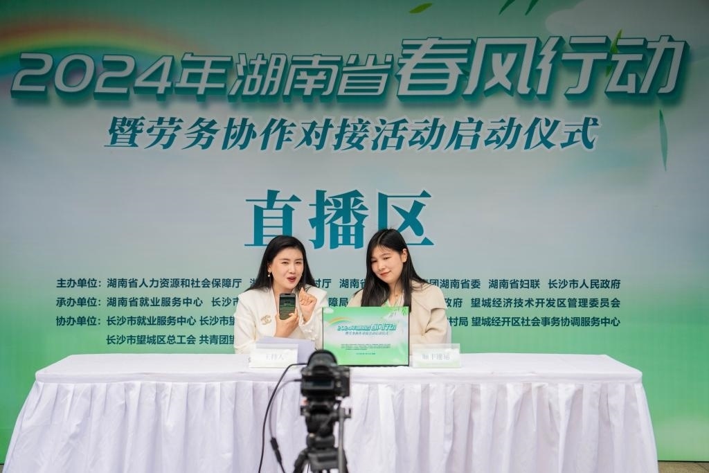 2月19日,在湖南省長沙市望城區(qū)市民廣場,工作人員在“春風(fēng)行動(dòng)”招聘活動(dòng)上通過網(wǎng)絡(luò)直播推薦工作崗位。新華社記者 陳思汗 攝