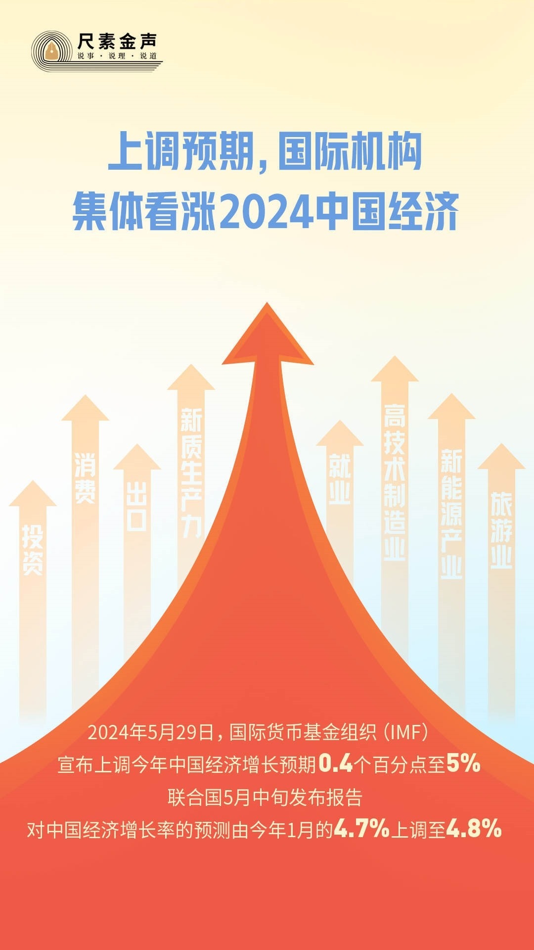 5月29日,國際貨幣基金組織(IMF)宣布上調今年中國經濟增長預期0.4個百分點至5%。聯合國5月中旬發(fā)布報告,對中國經濟增長率的預測由今年1月的4.7%上調至4.8%。4月以來,亞洲開發(fā)銀行、摩根士丹利、高盛、瑞銀等國際金融機構紛紛上調對中國經濟增速的全年預期。
