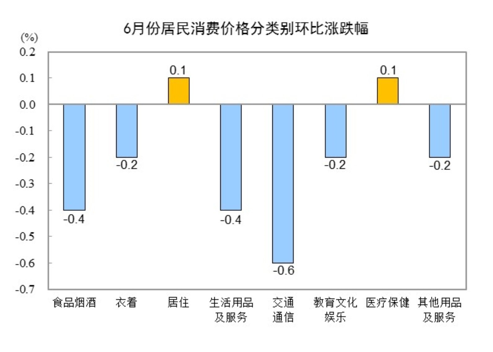 6月份,全國居民消費價格環(huán)比下降0.2%。其中,城市下降0.2%,農(nóng)村下降0.2%;食品價格下降0.6%,非食品價格下降0.2%;消費品價格下降0.4%,服務(wù)價格持平。