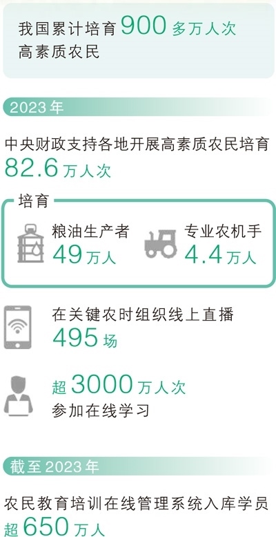 目前,我國(guó)累計(jì)培育900多萬人次高素質(zhì)農(nóng)民。嘗鮮新技術(shù)、涉足新業(yè)態(tài),一批批高素質(zhì)農(nóng)民積極擁抱專業(yè)化、規(guī)?;?、標(biāo)準(zhǔn)化的現(xiàn)代經(jīng)營(yíng)理念,為農(nóng)業(yè)農(nóng)村發(fā)展保持穩(wěn)中向好態(tài)勢(shì)提供了有力支撐。