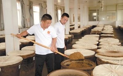 一旁,28歲的學徒李君正把缸里的醋醅翻到另一個醋缸之中。這是為了降溫而進行的“打平翻缸”操作,要持續(xù)15天時間?!八螏煾嫡f,發(fā)酵環(huán)節(jié)最難掌握的就是溫度的控制和時機?!币郧胺N地為生的李君,已經(jīng)跟著宋俊鵬學了5年釀醋,一個月有將近4000元的收入,“學會獨門技藝,咱也是手藝人了!”