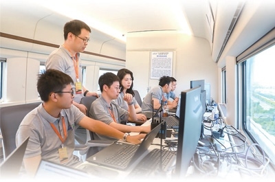 CR450青年團(tuán)隊(duì)成員在試驗(yàn)列車上研討技術(shù)細(xì)節(jié)。