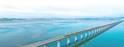試驗(yàn)列車行駛在湄洲灣跨海大橋上。