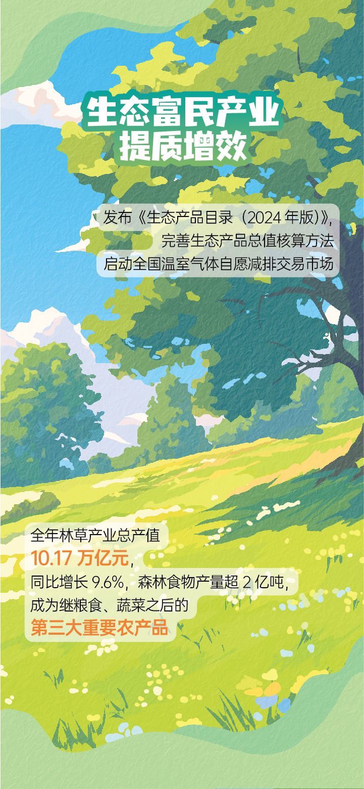 “我們持續(xù)深化改革,推進(jìn)生態(tài)富民產(chǎn)業(yè)提質(zhì)增效。”張利明說(shuō),全年林草產(chǎn)業(yè)總產(chǎn)值10.17萬(wàn)億元,同比增長(zhǎng)9.6%,森林食物產(chǎn)量超2億噸,成為繼糧食、蔬菜之后的第三大重要農(nóng)產(chǎn)品。