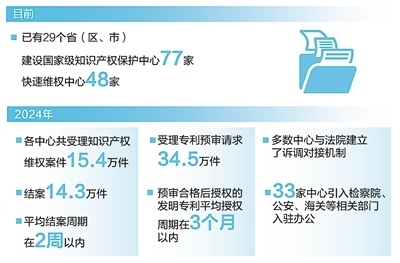 保護(hù)知識產(chǎn)權(quán)就是保護(hù)創(chuàng)新。中共中央、國務(wù)院印發(fā)的《知識產(chǎn)權(quán)強(qiáng)國建設(shè)綱要(2021—2035年)》提出,“建立完善知識產(chǎn)權(quán)仲裁、調(diào)解、公證、鑒定和維權(quán)援助體系”。目前,已有29個?。▍^(qū)、市)建設(shè)國家級知識產(chǎn)權(quán)保護(hù)中心77家、快速維權(quán)中心48家。