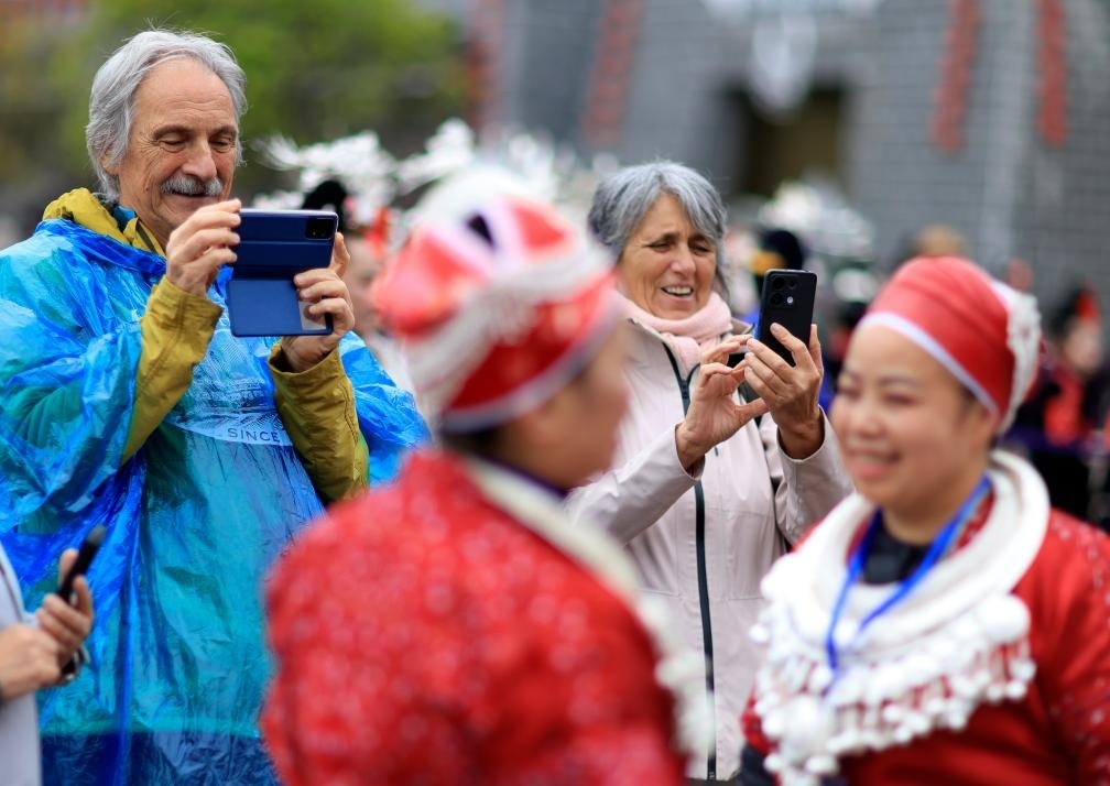 4月12日,外國游客在貴州省黔東南苗族侗族自治州臺江縣舉行的“苗族姊妹節(jié)”慶?;顒?dòng)上拍攝。新華社記者劉續(xù) 攝