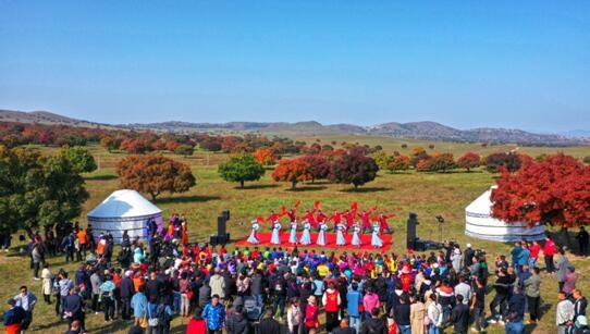 五角楓紅了,人們?cè)趤?lái)到這里載歌載舞慶豐收。梁永峰 攝
