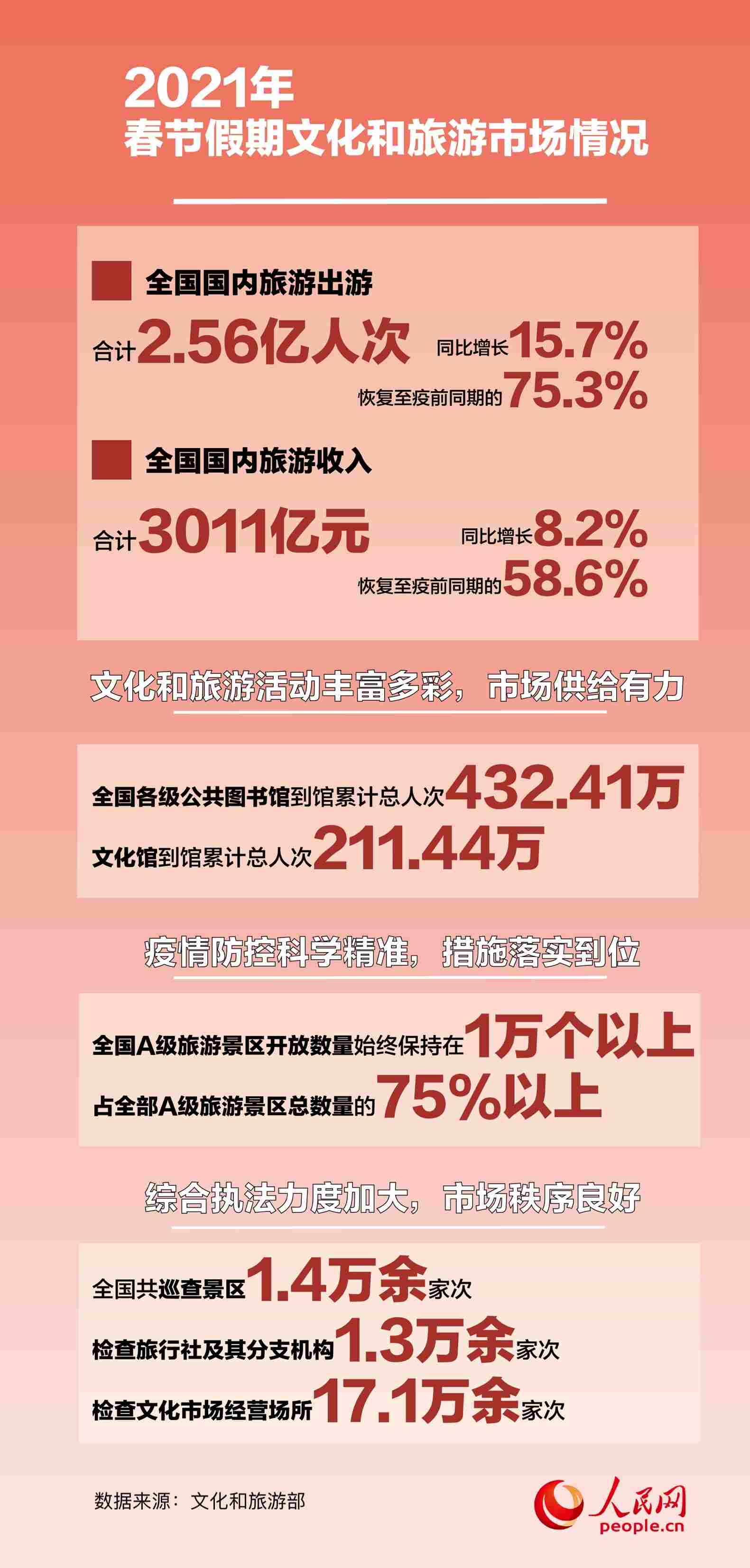 人民網(wǎng)北京2月25日電 (白帆)2月25日,文化和旅游部發(fā)布了2021年春節(jié)假期文化和旅游市場情況。數(shù)據(jù)顯示,綜合各地文化和旅游部門、通訊運(yùn)營商、線上旅行服務(wù)商的數(shù)據(jù),經(jīng)文化和旅游部數(shù)據(jù)中心測算,春節(jié)假期七天,全國國內(nèi)旅游出游合計(jì)2.56億人次,同比增長15.7%,恢復(fù)至疫前同期的75.3%。實(shí)現(xiàn)國內(nèi)旅游收入3011億元,同比增長8.2%,恢復(fù)至疫前同期的58.6%。