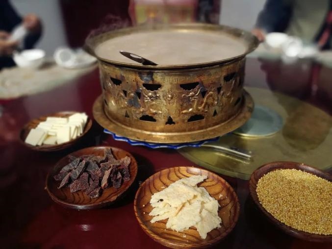 傳統(tǒng)鍋茶的制作方法是先用銅鍋將奶茶熬好,之后加入風(fēng)干肉、奶酪、奶皮子等,在鍋中邊煮邊吃。吃的時(shí)候?qū)⒛滩枋⒃谕胫?,加上奶豆腐和炒米,再和黃油混在一起。越往后,炒米和奶豆腐泡得越軟,味道口感越好。鍋茶咸咸的口味中含有濃濃的奶香,讓人回味無窮。