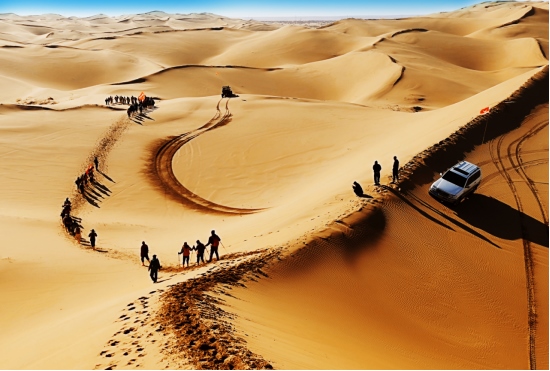4月8日,內(nèi)蒙古鄂爾多斯杭錦旗境內(nèi)的庫布其沙漠,一隊(duì)游客正在沙漠中穿沙。