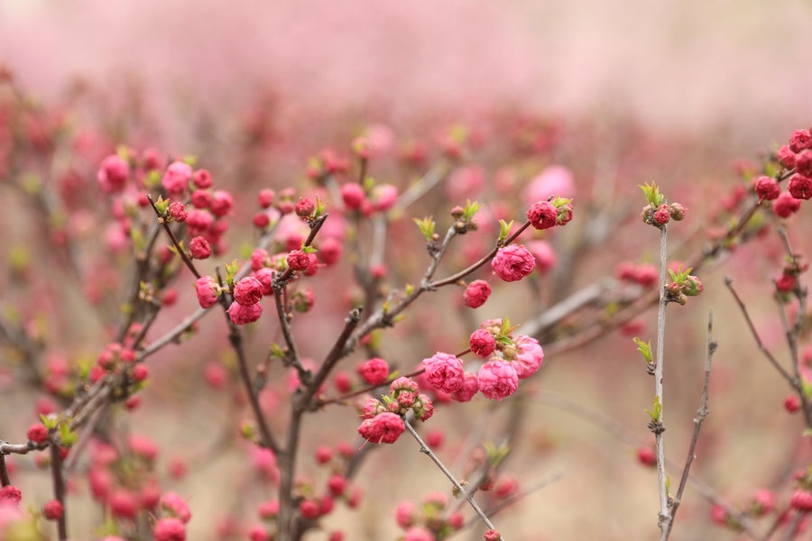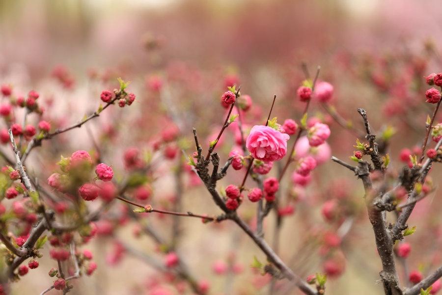 據了解,榆葉梅是薔薇科桃屬灌木稀小喬木植物,花果期為4月至7月,先開花,后長葉,其果實近球形,紅色,果肉薄。因其葉片像榆樹葉,花朵酷似梅花而得名榆葉梅。