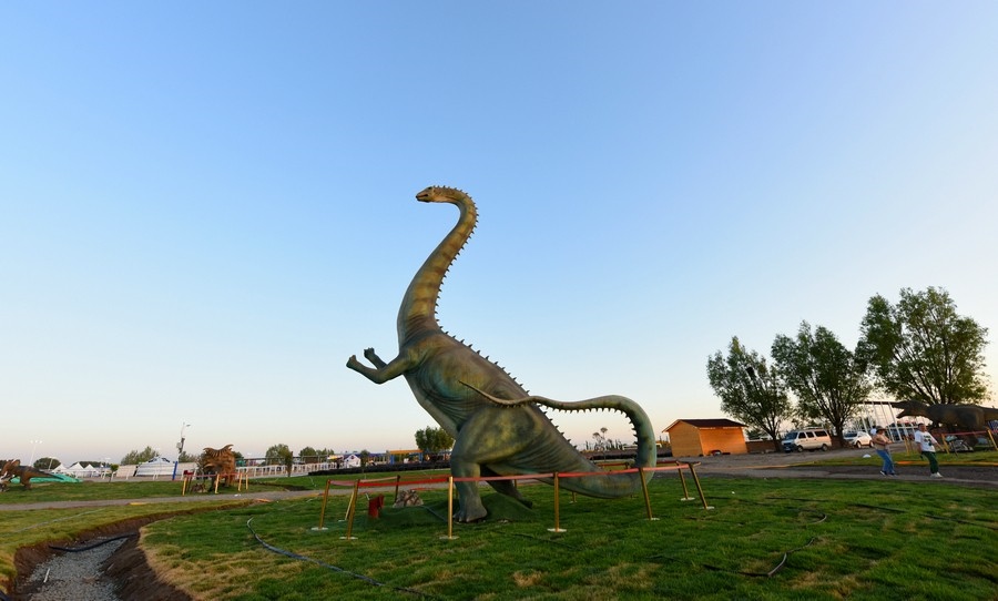 游客從高25米的亞洲最大的三條恐龍之一腳下經(jīng)過 記者 張楊攝影