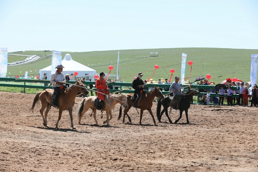 文藝演出結(jié)束后,進行了傳統(tǒng)的那達慕賽事項目。賽馬場上群馬奔騰、塵土飛揚,場面蔚為壯觀,騎手們揚鞭策馬,展現(xiàn)出精湛的騎術(shù),贏得觀眾陣陣歡呼。摔跤場上,搏克手你來我往互不相讓,斗智斗勇……