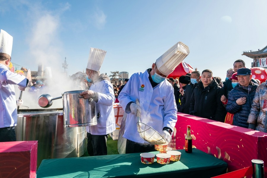 2024年2月15日,工作人員在呼和浩特市玉泉區(qū)塞上老街旅游休閑街區(qū)“千人餃子”品鑒活動(dòng)現(xiàn)場(chǎng)為游客盛餃子。丁根厚 攝