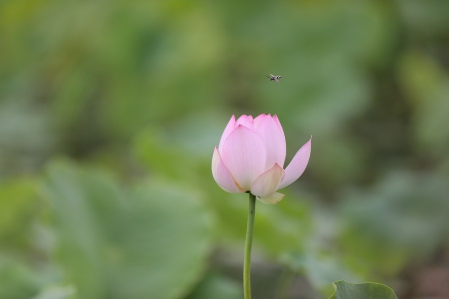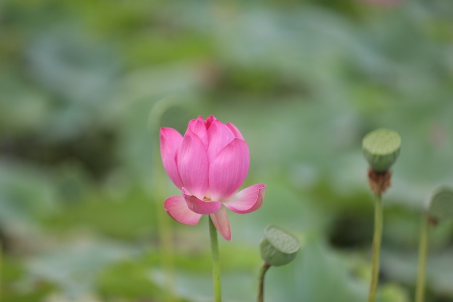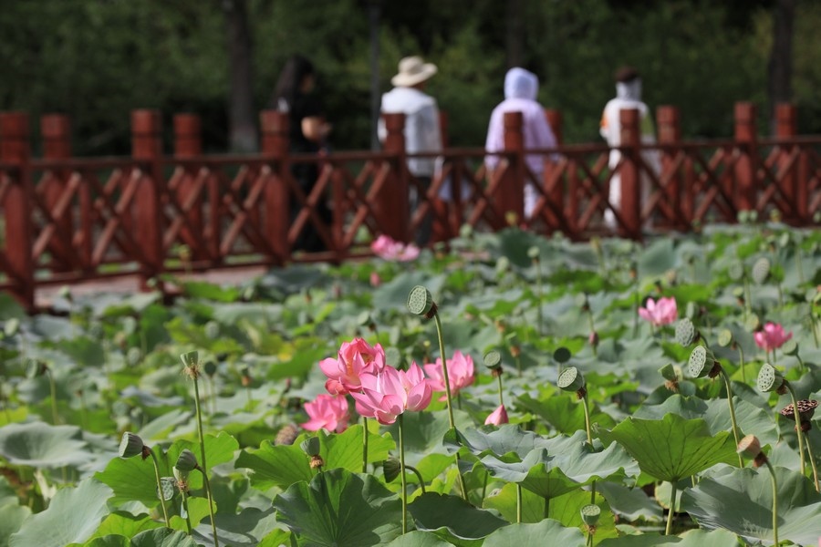初秋時節(jié),水光瀲滟間,公園內(nèi)的滿池荷花嬌艷、荷葉青翠,漫步棧道中,仿佛置身于一幅詩意的畫卷。