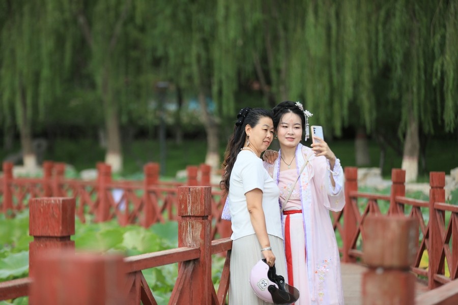 8月10日,內(nèi)蒙古烏海人民公園內(nèi)的荷花正盛放。游客在此拍照。