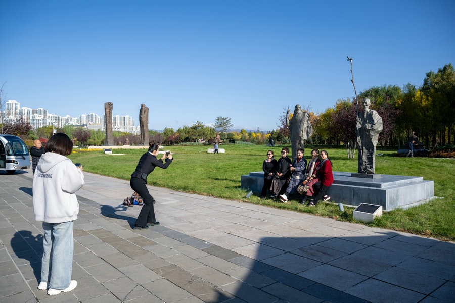 10月18日 游客在呼和浩特國(guó)際雕塑園拍照留念