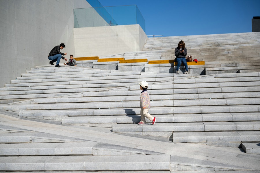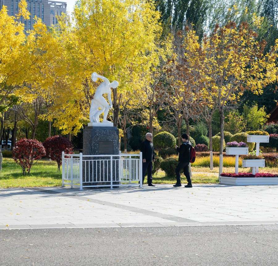 10月18日,家長(zhǎng)在呼和浩特雕塑藝術(shù)館外為孩子拍攝