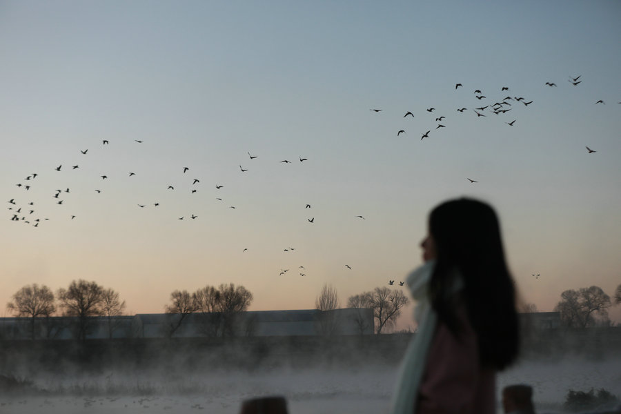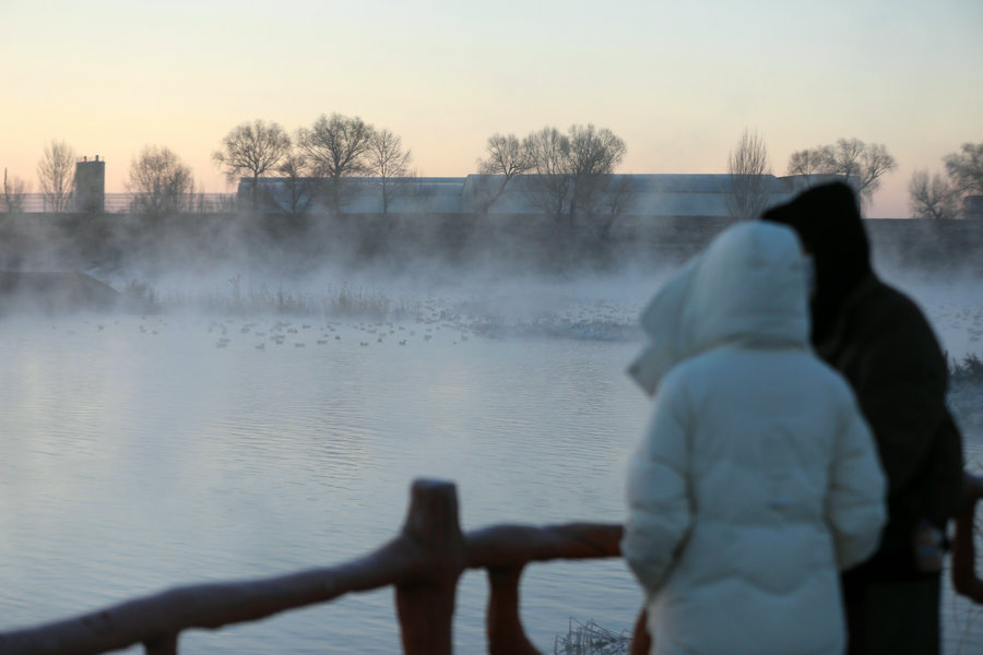 12月15日清晨,上千名游人在呼和浩特玉泉區(qū)班定營村南側(cè)的塞外“千島湖”畔賞景打卡。此處湖水為城市污水經(jīng)處理達標(biāo)后的再生水,隆冬時節(jié),再生水流入湖中,水汽蒸騰,岸邊草木霧凇皚皚,良好的生態(tài)吸引了數(shù)萬只赤麻鴨在此翔集棲息,構(gòu)成一幅生動和諧的美麗畫面。每日清晨,都有上千名游客來此觀日出賞美景。