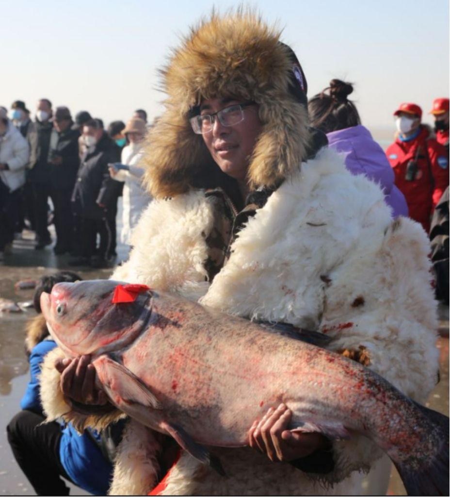 2022年起,土默特左旗利用哈素海天然的物產(chǎn)優(yōu)勢開辦“冬捕節(jié)”,待到冰面凍結(jié)實,就可以開冰放網(wǎng),一夜過后就可以拉網(wǎng)收魚,此時岸邊的大鐵鍋早已沸騰,只等鮮魚下鍋。一碗燉魚下肚,冬季的嚴寒無影無蹤,只余下滿口鮮香和帶著暖意的豐收喜悅。這一鍋暖意仍將延續(xù),哈素海的鮮魚即將在2025年1月歡騰于冰面,等著游客來品嘗這份隆冬的饋贈。