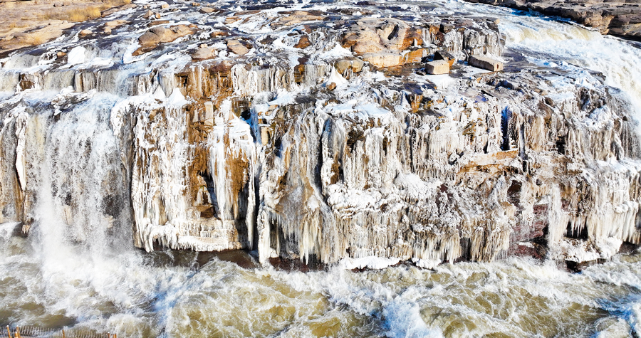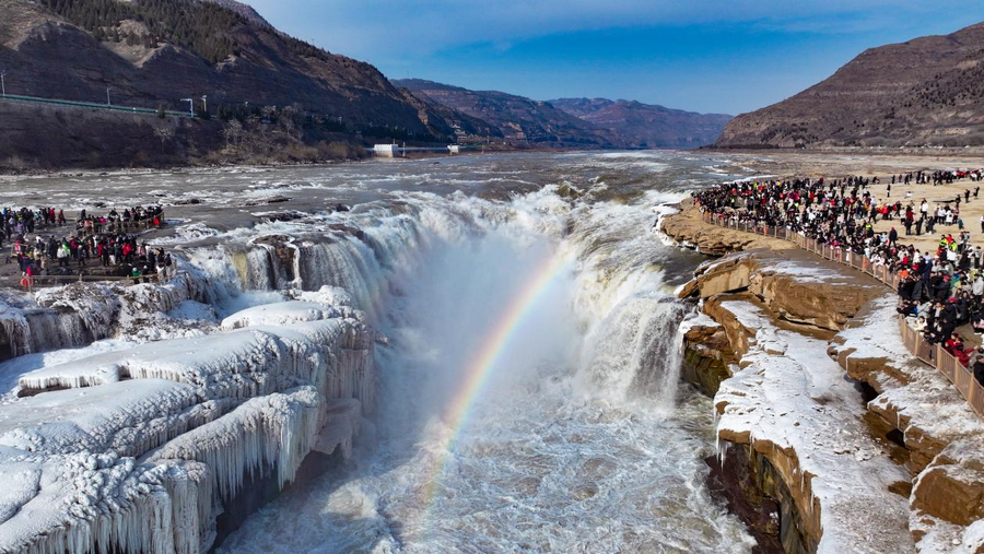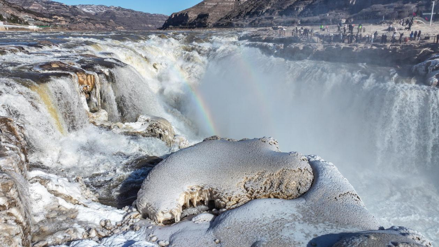 2月6日,受近日持續(xù)降溫天氣影響,位于秦晉大峽谷的陜西壺口瀑布景區(qū)出現(xiàn)冰瀑玉壺景觀。從空中俯瞰,滔滔黃河水奔騰咆哮,場面蔚為壯觀,飛濺起的浪花和彌漫的水霧在兩岸巖石和護(hù)欄上迅速凝結(jié),形成形狀各異的冰掛,晶瑩剔透,美不勝收,飛瀑上空偶現(xiàn)的彩虹與冰掛同框,交相輝映。由于近期黃河水流量上漲,達(dá)到700立方米每秒,景區(qū)主側(cè)瀑布攜手傾瀉,呈現(xiàn)“90版50元人民幣”上的壯美瀑布景觀,游客一次旅程可觀看雙瀑奇觀。