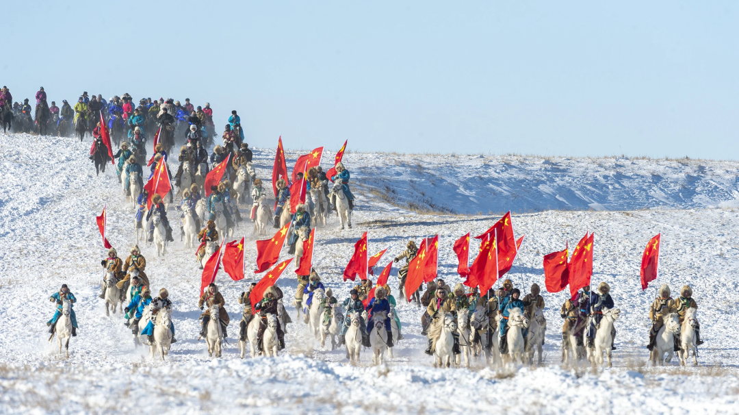 9時50分,在護(hù)旗方陣的護(hù)衛(wèi)下,鮮艷的五星紅旗冉冉升起,《義勇軍進(jìn)行曲》響徹云霄,萬人肅立齊唱。方陣入場式上,200名農(nóng)牧民手持火紅的辣椒、金黃的向日葵和飽滿的西瓜,用豐收的喜悅“描繪”鄉(xiāng)村振興畫卷;400名“民族大家庭”方陣成員身著五彩盛裝,恰似民族團(tuán)結(jié)的斑斕錦緞;企業(yè)代表、干部職工代表、裁判、射箭手、搏克手等方陣依次入場,大家精神抖擻,昂首闊步,展現(xiàn)出全旗各族人民團(tuán)結(jié)奮進(jìn)的精神面貌;最令人心潮澎湃的當(dāng)數(shù)蒙古馬方陣——百匹駿馬踏著《黑駿馬》的悠揚琴聲奔騰而來,馬蹄卷起草浪,鬃毛飛揚如旗,將北疆兒女的豪邁氣概演繹得淋漓盡致。