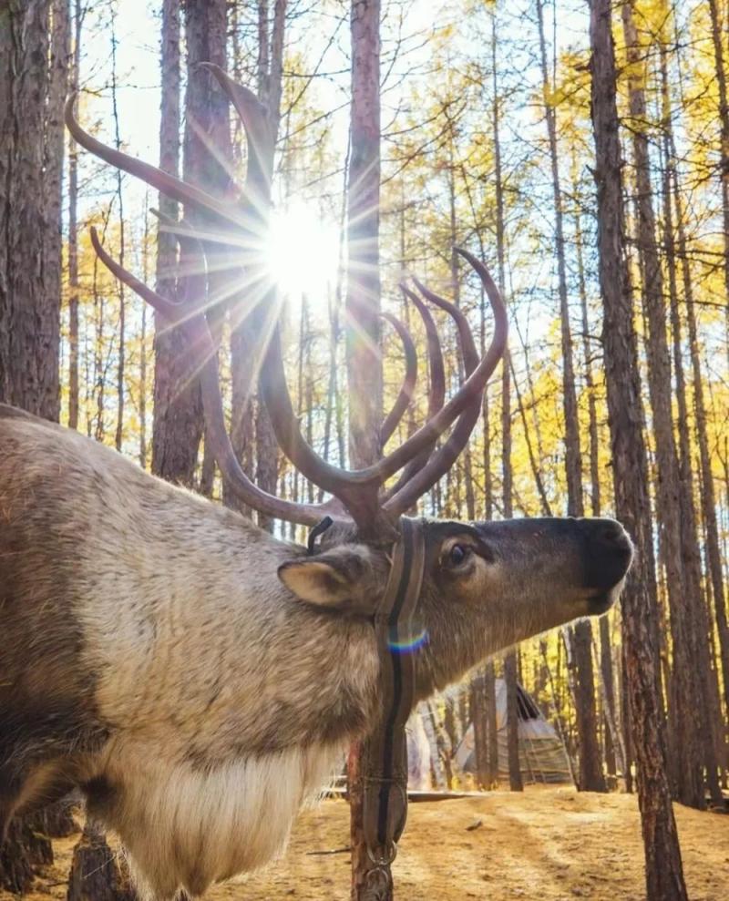馴鹿互動:16:00至17:00林區(qū)光線柔和,讓模特手持苔蘚投喂馴鹿,用連拍模式抓拍馴鹿抬頭、人物微笑的瞬間;馴鹿低頭時,可拍攝人物輕撫鹿角的特寫,體現(xiàn)人與動物的溫情。