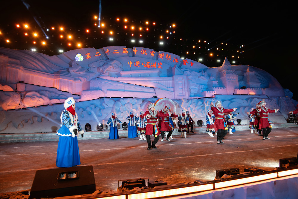 作為當(dāng)日重頭戲,冰雪節(jié)開幕式暨《冰雪芳華》主題樂園開園儀式于晚間精彩上演。中俄蒙三國表演團(tuán)隊(duì)輪番登臺,用悠揚(yáng)的歌聲、靈動的舞姿傳遞三國友誼,為現(xiàn)場觀眾獻(xiàn)上一場兼具民族風(fēng)情與國際視野的文化盛宴。