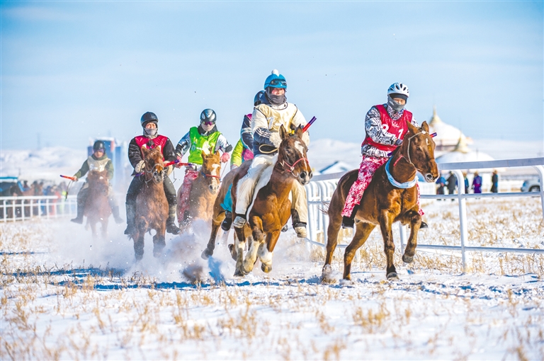 1月18日,錫林浩特市那達(dá)慕風(fēng)情園內(nèi)馬蹄踏雪、人聲鼎沸,“歌游內(nèi)蒙古·暢享錫林浩特”——冬季那達(dá)慕暨蒙古馬超級聯(lián)賽在歡騰的歌聲中拉開序幕。開幕式上,隨著馬蹄的噠噠聲,一支雄壯的馬隊(duì)踏雪而來,騎手們身著艷麗的蒙古袍,駕馭著矯健的蒙古馬,以整齊的隊(duì)列自遠(yuǎn)處緩緩走來。歌聲悠揚(yáng),舞姿豪邁,演員們以動人的演繹,完美詮釋了力量與藝術(shù)之美。本次賽事包含15公里耐力賽、10公里3人團(tuán)體接力賽、跑馬射箭、跑馬拾哈達(dá)、6公里走馬及搏克比賽等比賽項(xiàng)目。賽場上,騎手們馭馬飛馳,人與馬默契配合,在銀裝素裹的雪原上縱橫馳騁。在跑馬射箭與跑馬拾哈達(dá)項(xiàng)目上,騎手在飛奔的馬匹上挽弓搭箭、俯身拾物,動作行云流水,精湛技藝引來觀眾陣陣驚呼與贊嘆。除了扣人心弦的比賽,本次活動還為游客打造了豐富的冰雪互動體驗(yàn)。冰雪涮肉宴香氣四溢,草原篝火電音派對將熱情推向高潮,千人雪戰(zhàn)、雪地拔河等趣味項(xiàng)目讓游客親身參與,盡情享受冰雪樂趣?,F(xiàn)場還同步舉辦了錫林浩特“伊德喜”草原冬儲肉展銷活動,讓游客在觀賽之余,還能選購到正宗錫林郭勒牛羊肉,體驗(yàn)純正的草原風(fēng)味。(記者