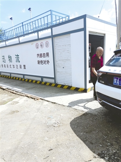6月29日16時許,記者來到回民區(qū)塞外安康新居小區(qū)。該小區(qū)旁邊是一處老舊廠區(qū)。記者開車進(jìn)入這個老舊廠區(qū)看到,在大門的左手邊有一臺撬裝式加注裝置。這時,一名中年婦女告訴記者,加油往里走,這臺裝置壞了。隨后,記者開車又往廠區(qū)院里走了約50米,在路的右側(cè)有一臺撬裝式加注裝置,這臺裝置距離塞外安康新居小區(qū)的居民樓很近(如圖二)。記者把車停在加注裝置旁邊,一位老人熟練地打開車的油箱蓋,問記者加多少錢的油。加油過程中,老人告訴記者,“這個撬裝式加注裝置是向安監(jiān)部門申請的,供單位內(nèi)部用油。”記者詢問:“既然是供單位內(nèi)部使用,那對外加油不怕被查?”老人說:“執(zhí)法部門查不查,那是老板的事兒。因?yàn)橛捅阋耍瑏磉@里加油的人不少?!边@里92號汽油每升為4.3元。