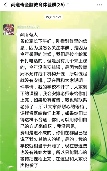 根據(jù)謝女士提供的轉(zhuǎn)賬證明和聊天截圖記者注意到,“尚道奇全腦教育體驗(yàn)群”1月15日發(fā)布的一則通知稱,今年暑假,機(jī)構(gòu)老師曾挨個給家長打電話通知上課,但是沒有幾個來上課的,加上教育局不允許線下機(jī)構(gòu)開課,所以課程遲遲沒有安排。并稱學(xué)校賠錢了,沒有錢退給大家,只能耐心等待疫情結(jié)束后安排上課,如果家長覺得不合適,可以用自己的方式維權(quán)?!八恼f辭明顯前后矛盾,暑假期間說課件損毀,現(xiàn)在又說沒學(xué)生上課?!敝x女士氣憤地說,和她遭遇同樣情況的還有30多名家長,399元雖然不是大數(shù)目,但這樣欺騙大家實(shí)屬不該。