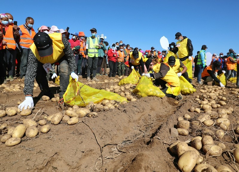 豐收節(jié)現(xiàn)場(chǎng),還舉行了別開(kāi)生面的土豆趣味運(yùn)動(dòng)會(huì),6支代表隊(duì)參加了比賽,裁判員以速度計(jì)時(shí)、數(shù)量稱(chēng)重等方式來(lái)決定最后的勝負(fù),比賽過(guò)程熱火朝天,參賽者的臉上洋溢著喜悅的笑容。