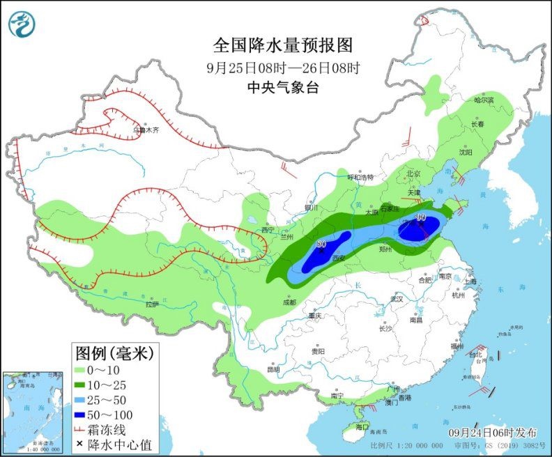 9月25日08時至26日08時,西北地區(qū)東部、華北南部、黃淮大部等地部分地區(qū)有中到大雨,其中,甘肅東部、陜西中南部、山東中南部等地部分地區(qū)有暴雨(50~90毫米)。內(nèi)蒙古中西部、遼東半島等地部分地區(qū)有4~6級風(fēng)。
