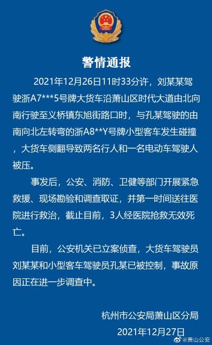 中新網(wǎng)12月27日電 杭州市公安局蕭山區(qū)分局27日通報,12月26日11時33分許,一大貨車與一小型客車在蕭山區(qū)一路口發(fā)生碰撞,大貨車側(cè)翻導致兩名行人和一名電動車駕駛?cè)吮粔?。截至目前?人經(jīng)醫(yī)院搶救無效死亡。
