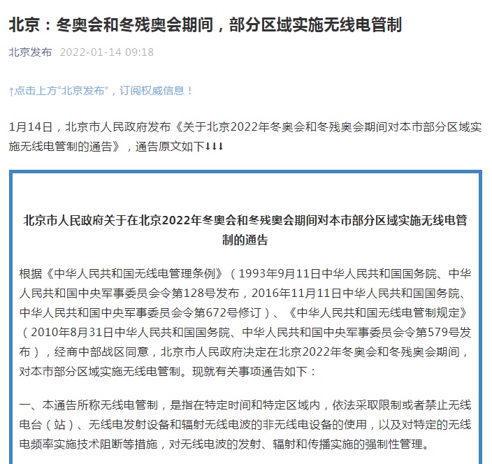 根據(jù)《中華人民共和國無線電管理條例》《中華人民共和國無線電管制規(guī)定》,經(jīng)商中部戰(zhàn)區(qū)同意,北京市人民政府決定在北京2022年冬奧會和冬殘奧會期間,對本市部分區(qū)域?qū)嵤o線電管制。具體有關事項通告如下: