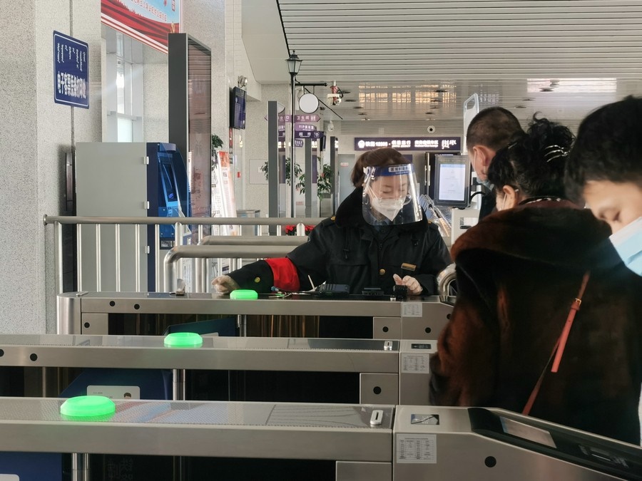 1月17日,春運(yùn)首日,集寧站烏蘭察布站客運(yùn)人員組織旅客通過(guò)閘機(jī)有序檢票進(jìn)站。