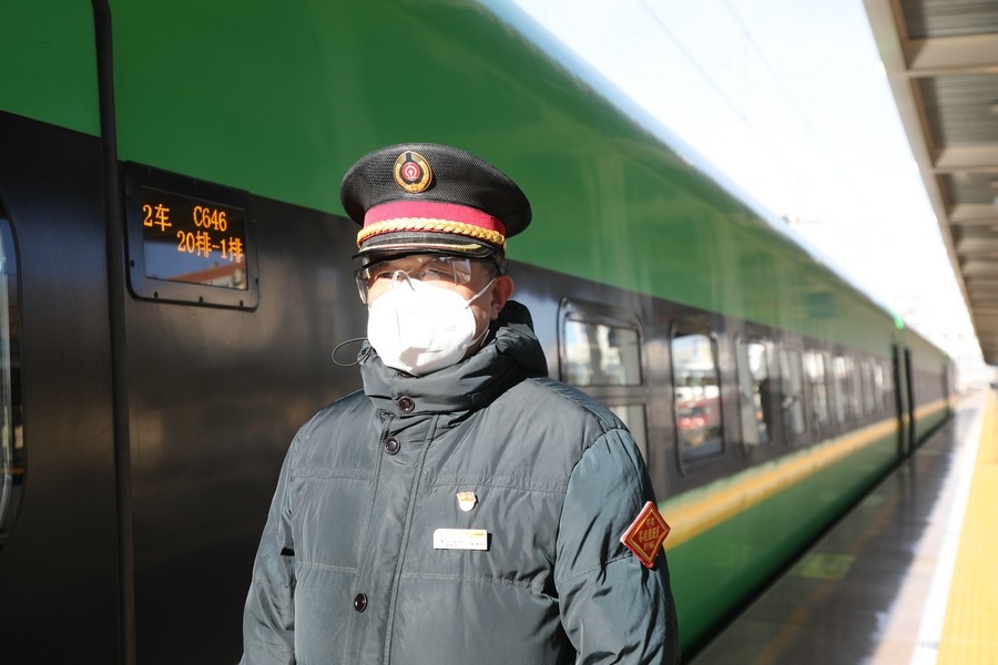 1月17日,圖為春運(yùn)首日,集寧南站客運(yùn)人員接發(fā)綠動(dòng)列車(chē)。