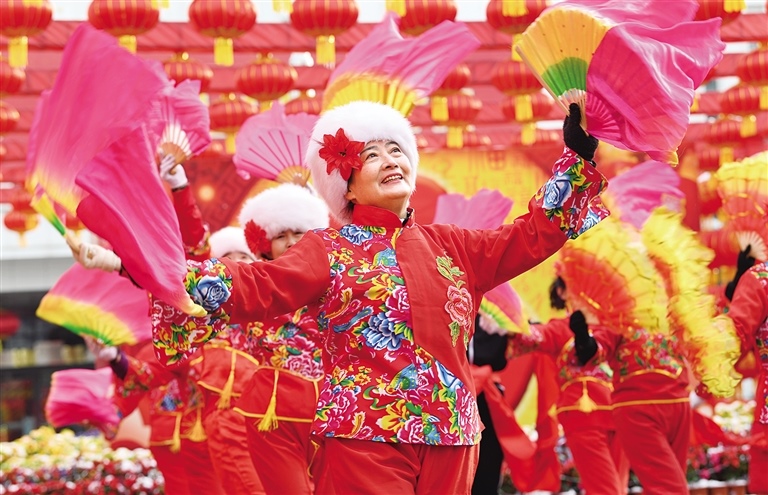 2月14日,演員們在內(nèi)蒙古展覽館廣場上跳起歡快的舞蹈。當日,內(nèi)蒙古展覽館開展“傳統(tǒng)文化月月傳”邀您一起鬧元宵活動。記者 王磊 攝
